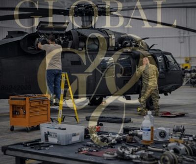 Technicians performing maintenance on a Black Hawk helicopter, MRO hangar, aeronautical spare parts.